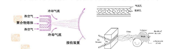 熔噴布的生產(chǎn)工藝便是熔噴非織造工藝,利用高速熱空氣對模頭噴絲孔擠出的聚合物熔體細流進行牽伸,由此形成超細纖維并凝聚在凝網(wǎng)簾或滾筒上,并依靠自身粘合而成為非織造布。