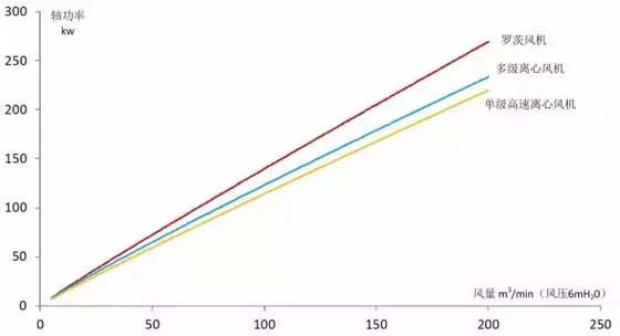 從上圖中可知,在風(fēng)機(jī)的效率方面單級(jí)高速離心風(fēng)機(jī)最高,多級(jí)離心風(fēng)機(jī)其次,羅茨風(fēng)機(jī)最低。同樣的供風(fēng)量,羅茨風(fēng)機(jī)能耗最高,單級(jí)高速離心風(fēng)機(jī)能耗最低。