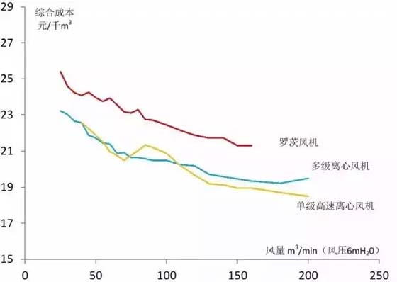從設(shè)備采購(gòu)成本看,羅茨風(fēng)機(jī)成本最低,多級(jí)離心風(fēng)機(jī)居中,單級(jí)高速離心風(fēng)機(jī)最高。綜合考慮能耗、設(shè)備采購(gòu)及運(yùn)行維護(hù)費(fèi)用等因素,三種風(fēng)機(jī)的流量與單位綜合成本比較見(jiàn)下圖。