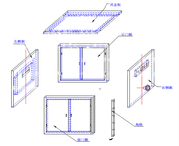 3. 用四根已打好孔的角鐵在四個(gè)角落處分別用M5*25 自攻螺釘聯(lián)接門板和側(cè)板。(角鐵寬的一面和側(cè)面相接,用電鉆配鉆),聯(lián)接要牢固。